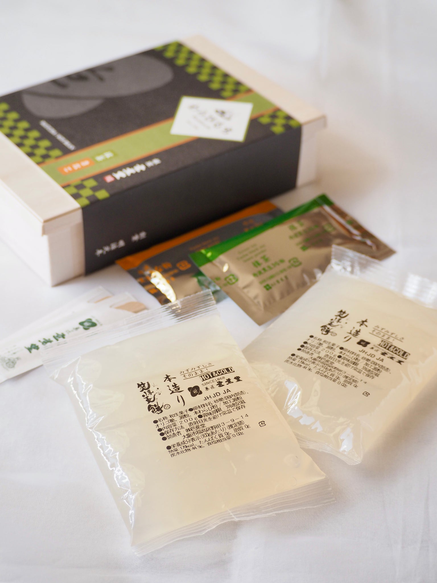 【わらび餅】砂糖(国内製造)、オリゴ糖、澱粉、 本わらび粉 /加工澱粉 【きな粉】丹波種黒大豆 【抹茶きな粉】丹波種黒大豆、抹茶 |