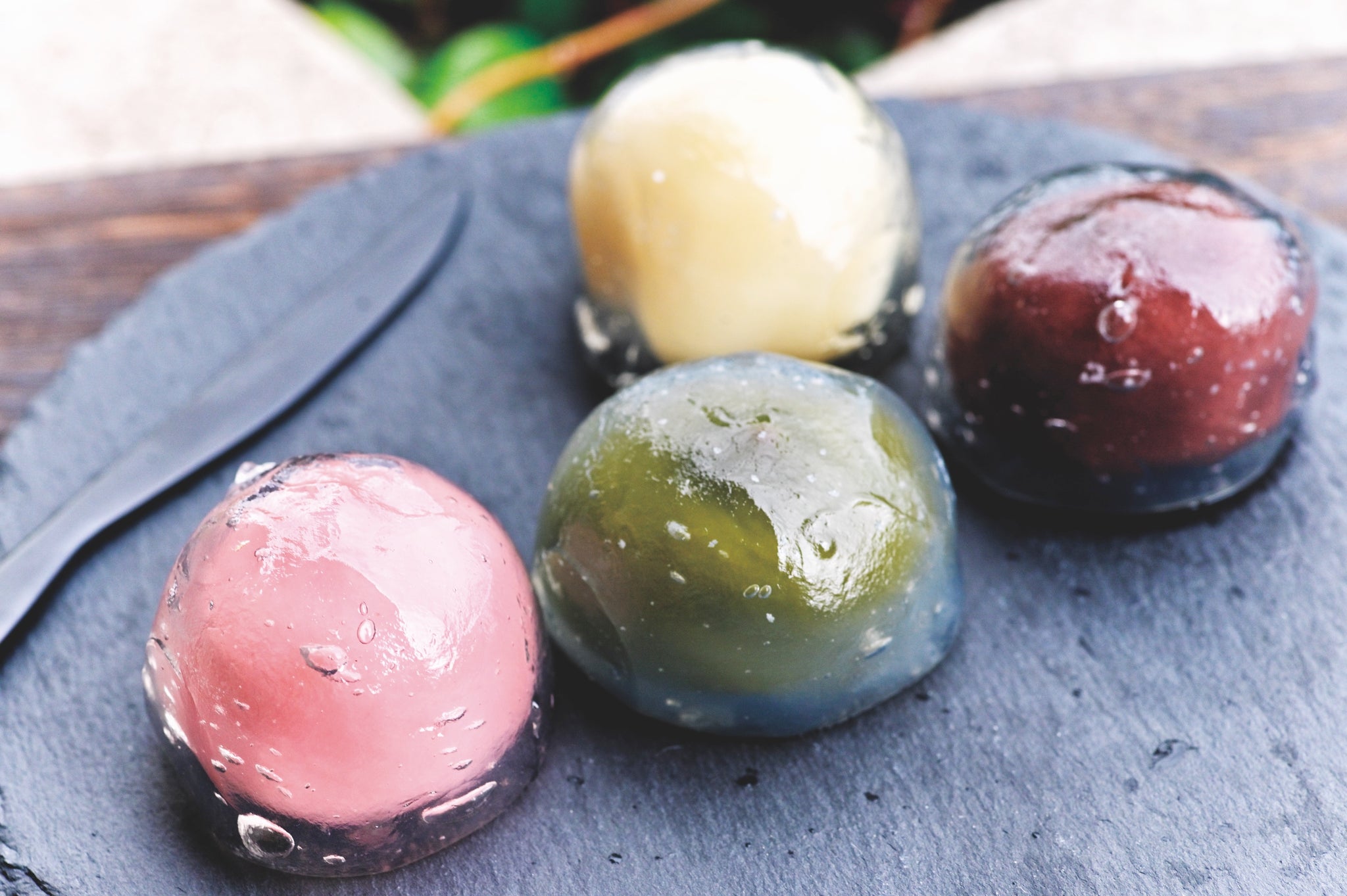 きな粉とまぶしてお召し上がりいただく「わらび餅」とは原料の配合や炊き方を変え、ほどよい弾力のもっちり食感に仕上げたわらび餅で、色とりどりの餡子を包みました。